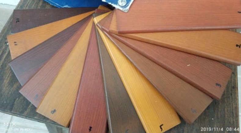 1. sötétnarancs 2., Tölgy 3.,Noce 4.,Teak 5.,rumena sárga 6.,Paliszander 7.,Mahagóni BH 8.,Tölgy L130 9.,Mahagóni 10.,Meranti mix 11.,Pinija(fenyő) 12., Bordó